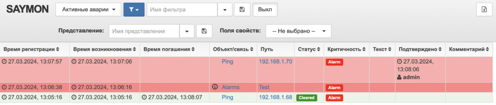 Зафиксированные аварийные ситуации мониторинга отображаются в списке активных аварий. Список аварий можно переключить в режим отображения исторических аварий. Аварии могут быть погашены и переведены в список исторических аварий автоматически (при выполнении необходимых условий) или вручную через контекстное меню объекта (связи).