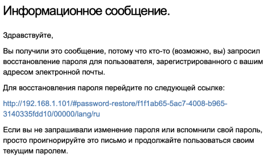 “content”: “Информационное сообщение.\n\n\nЗдравствуйте,\n\nВы получили это сообщение, потому что кто-то (возможно, вы) запросил восстановление пароля для пользователя, зарегистрированного с вашим адресом электронной почты.\n\nДля восстановления пароля перейдите по следующей ссылке:\n\n{{emailLink}}\n\nЕсли вы не запрашивали изменение пароля или вспомнили свой пароль, просто проигнорируйте это письмо и продолжайте пользоваться своим текущим паролем.”,