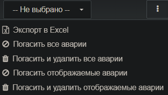 В новом релизе добавлена возможность погашения всех аварий через меню действий со списком аварий (открывается кнопкой в правом верхнем углу страницы). Пункты меню «Погасить отображаемые аварии» и «Погасить и удалить отображаемые аварии» погашают аварии с учетом установленных фильтров, а пункты «Погасить все аварии» и «Погасить и удалить все аварии» погашают все аварии в системе. Соответствующие аварии будут либо перемещены в историю аварий, либо полностью удалены.