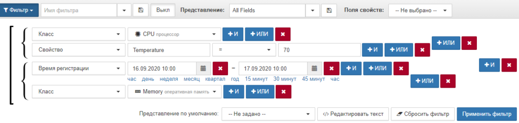 Фильтры позволяют отобразить список аварий согласно установленным критериям. Созданные условия фильтра можно произвольно комбинировать, используя операторы И и ИЛИ. Математические операторы сравнения используются для числовых значений, текстовые – для числовых и текстовых (без учета регистра). Фильтр можно сохранить для будущего быстрого использования после ввода всех необходимых критериев и имени фильтра.