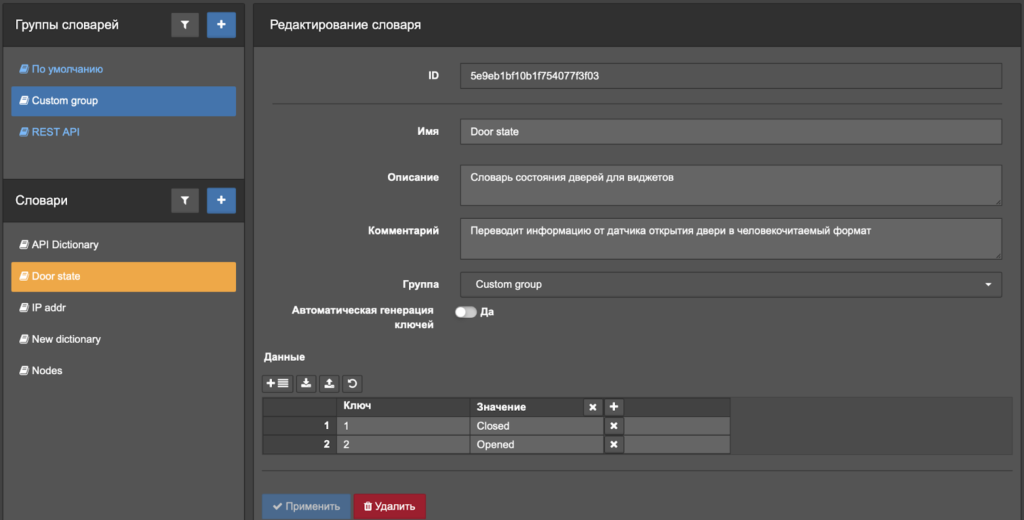 Активация функции автоматической генерации ключей приводит к автоматическому добавлению уникальных сгенерированных значений (в формате UUIDv4) в пустые ячейки со значением ключа. Заметим, что изменение информации в словарях, связанных с задачей мониторинга, сопровождается автоматическим обновлением соответствующих сенсоров.